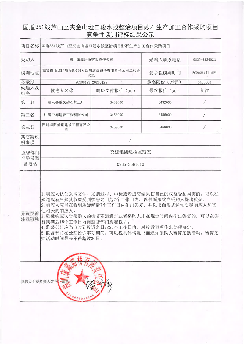 四川康藏路橋有限責任公司國道351線蘆山至夾金山埡口段水毀整治項目砂石生產(chǎn)加工合作采購項目競爭性談判評標結果公示