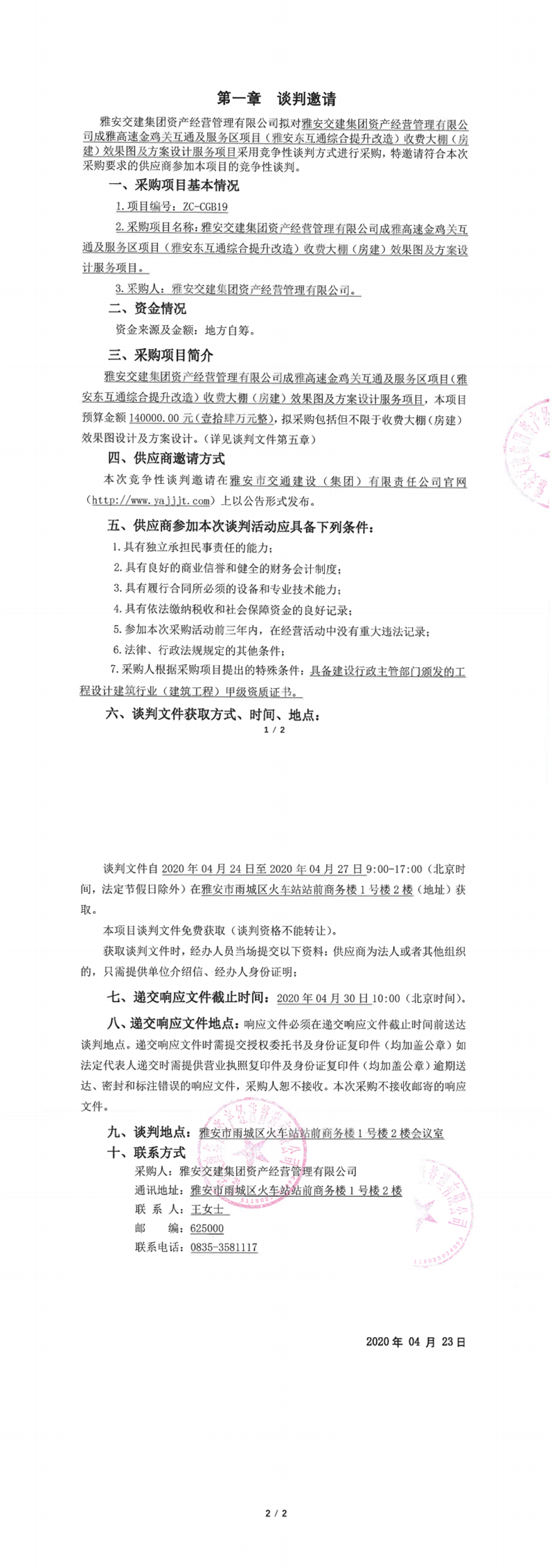 雅安交建集團(tuán)資產(chǎn)經(jīng)營管理有限公司成雅高速金雞關(guān)互通及服務(wù)區(qū)項目(雅安東互通綜合提升改造)收費大棚(房建)效果圖及方案設(shè)計服務(wù)項目競爭性談判公告
