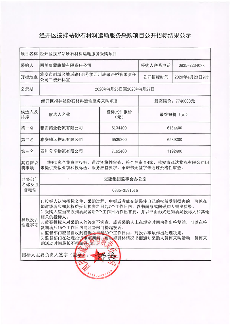 四川康藏路橋有限責任公司經(jīng)開區(qū)攪拌站砂石材料運輸服務采購項目公開招標結果公示