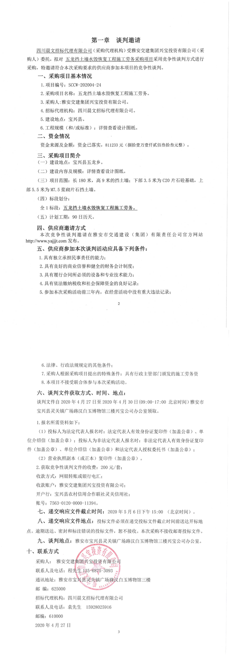 雅安交建集團興寶投資有限公司五龍擋土墻水毀恢復(fù)工程施工勞務(wù)采購項目競爭性談判公告