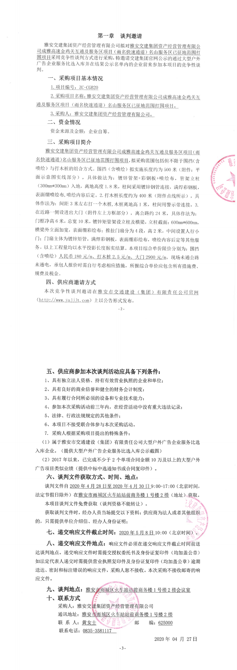 雅安交建集團(tuán)資產(chǎn)經(jīng)營管理有限公司成雅高速金雞關(guān)互通及服務(wù)區(qū)項目(雨名快速通道)名山服務(wù)區(qū)已征地范圍打圍項目競爭性談判公告