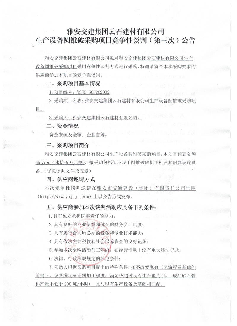 雅安交建集團(tuán)云石建材有限公司生產(chǎn)設(shè)備圓錐破采購項(xiàng)目競爭性談判(第三次)公告