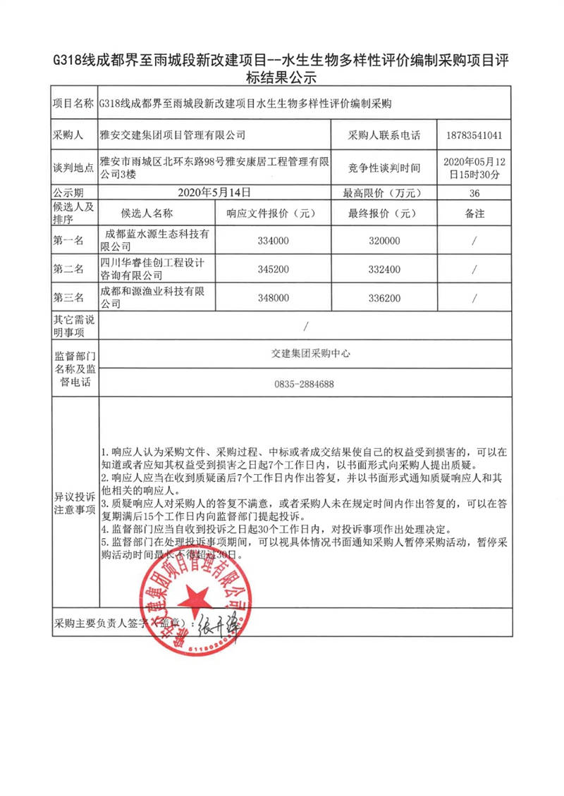 雅安交建集團項目管理有限公司G318線成都界至雨城段新改建項目水生生物多樣性評價編制采購項目評標結果公示