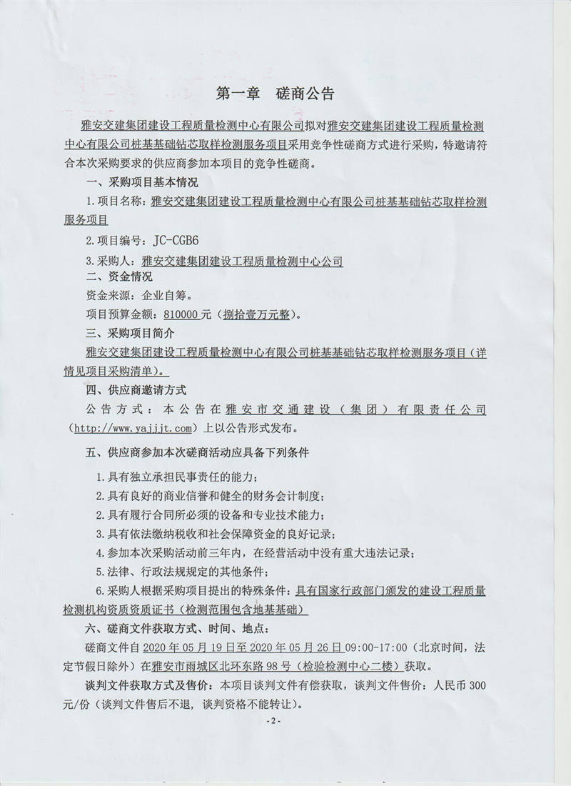 雅安交建集團建設(shè)工程質(zhì)量檢測中心有限公司樁基基礎(chǔ)鉆芯取樣檢測服務(wù)項目競爭性磋商公告