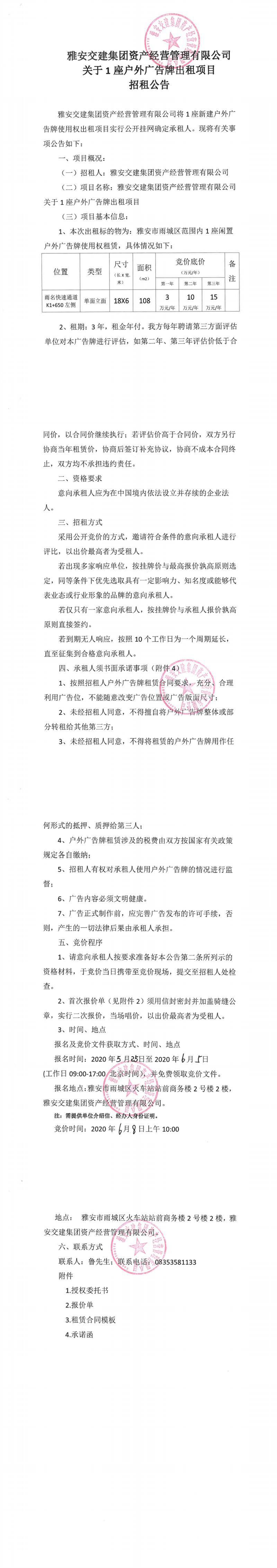 雅安交建集團資產(chǎn)經(jīng)營管理有限公司關(guān)于1座戶外廣告牌出租項目招租公告