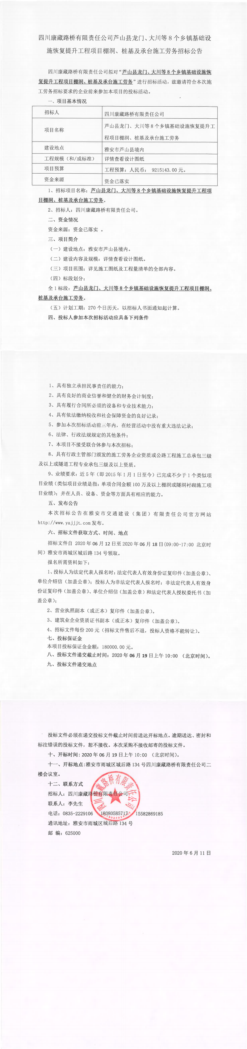 四川康藏路橋有限責任公司蘆山縣龍門、大川等8個鄉(xiāng)鎮(zhèn)基礎(chǔ)設(shè)施恢復(fù)提升工程項目棚洞、樁基及承臺施工勞務(wù)招標公告