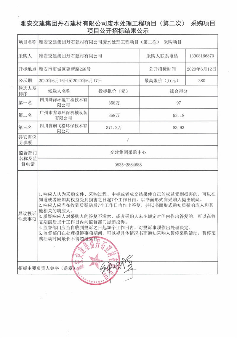 雅安交建集團(tuán)丹石建材有限公司廢水處理工程項(xiàng)目(第二次)采購(gòu)項(xiàng)目公開招標(biāo)結(jié)果公示