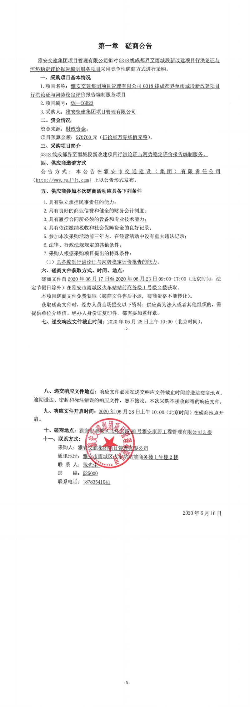 雅安交建集團項目管理有限公司G318線成都界至雨城段新改建項目行洪論證與河勢穩(wěn)定評價報告編制服務(wù)項目競爭性磋商公告