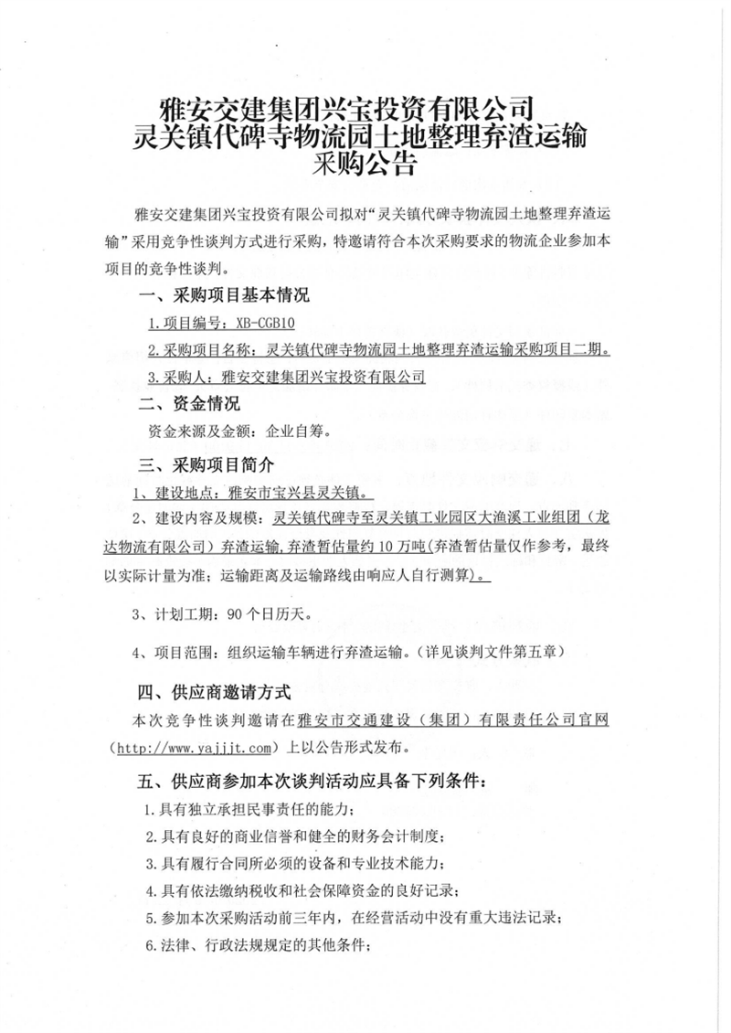 雅安交建集團(tuán)興寶投資有限公司靈關(guān)鎮(zhèn)代碑寺物流園土地整理?xiàng)壴\(yùn)輸采購(gòu)項(xiàng)目二期競(jìng)爭(zhēng)性談判公告