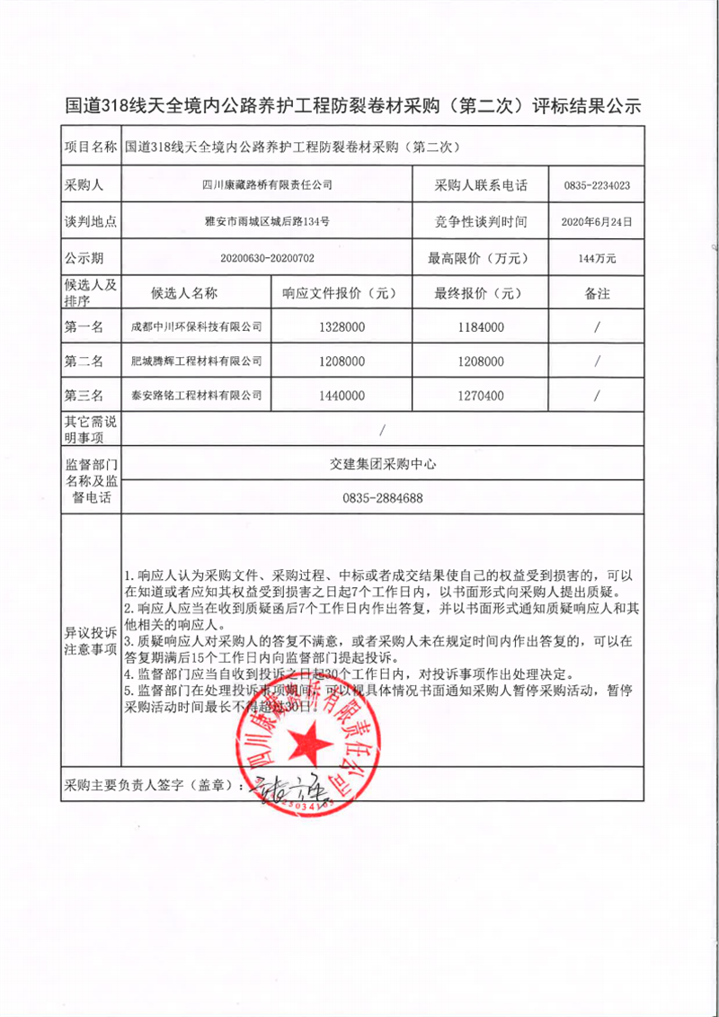 四川康藏路橋有限責(zé)任公司國道318線天全境內(nèi)公路養(yǎng)護(hù)工程防裂卷材采購(第二次)評(píng)標(biāo)結(jié)果公示