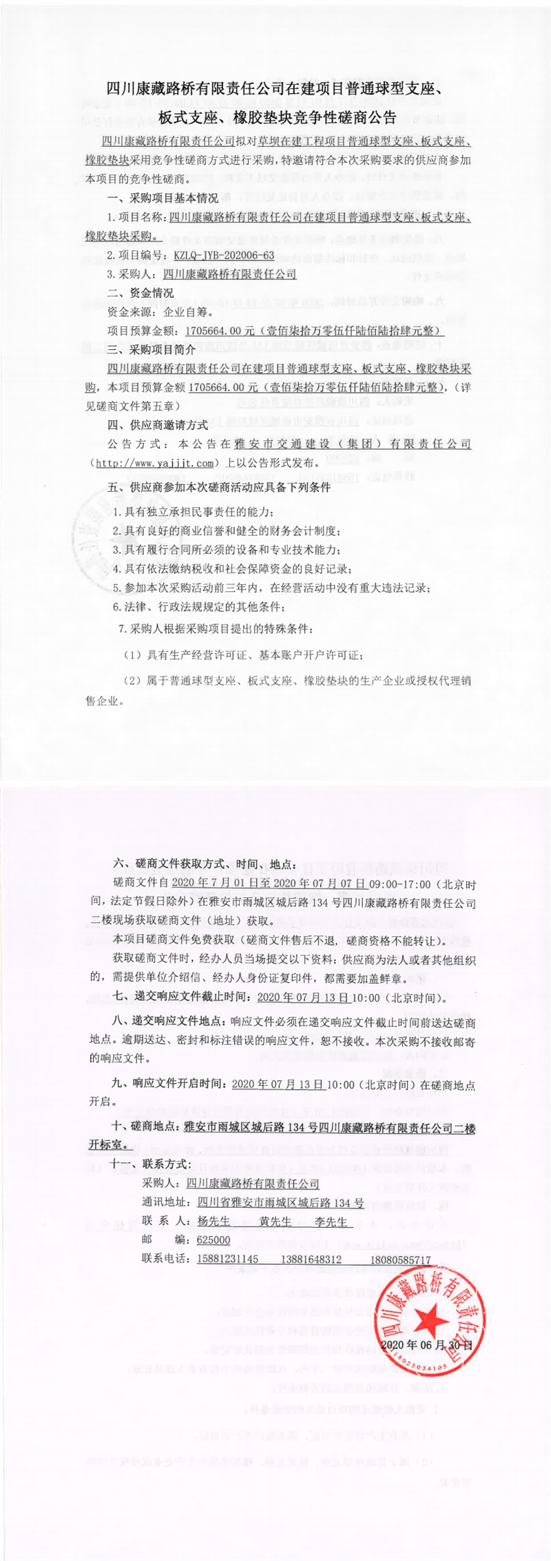 四川康藏路橋有限責(zé)任公司在建項(xiàng)目普通球型支座、板式支座、橡膠墊塊采購競爭性磋商公告