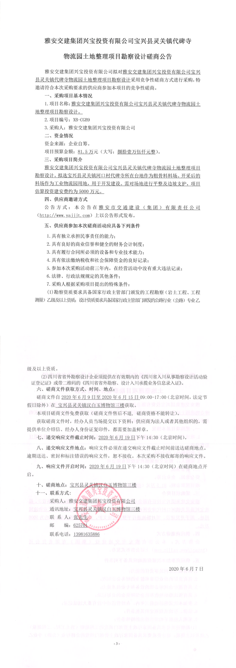 雅安交建集團(tuán)興寶投資有限公司寶興縣靈關(guān)鎮(zhèn)代碑寺物流園土地整理項(xiàng)目勘察設(shè)計(jì)競爭性磋商公告