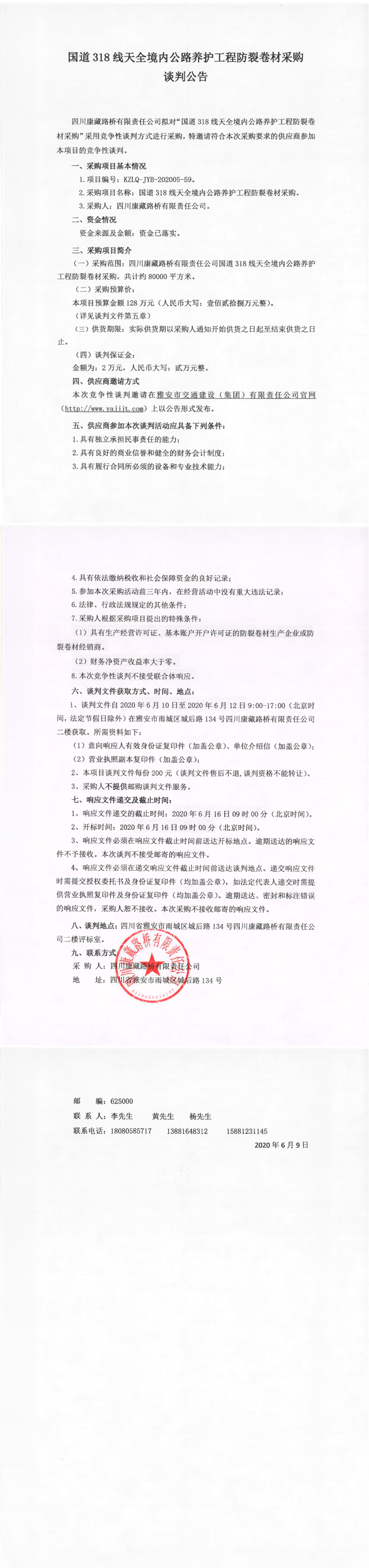 四川康藏路橋有限責任公司國道318線天全境內(nèi)公路養(yǎng)護工程防裂卷材采購競爭性談判公告