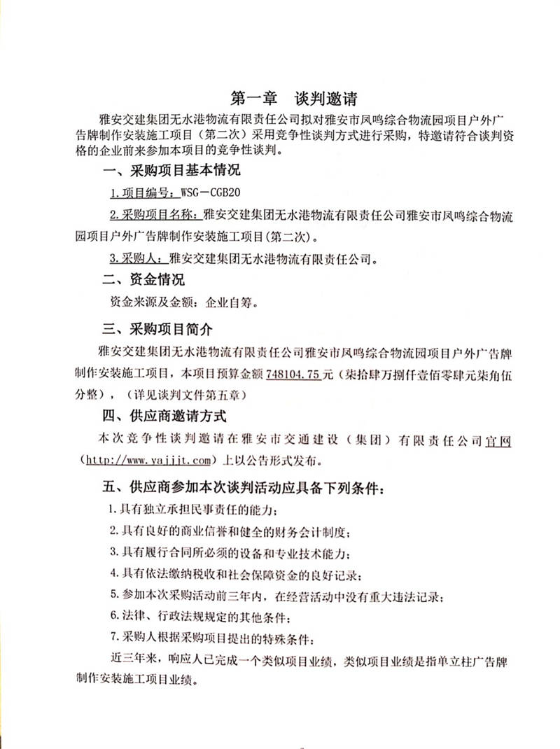 雅安交建集團(tuán)無水港物流有限責(zé)任公司雅安市鳳鳴綜合物流園項目戶外廣告牌制作安裝施工項目(第二次)競爭性談判公告