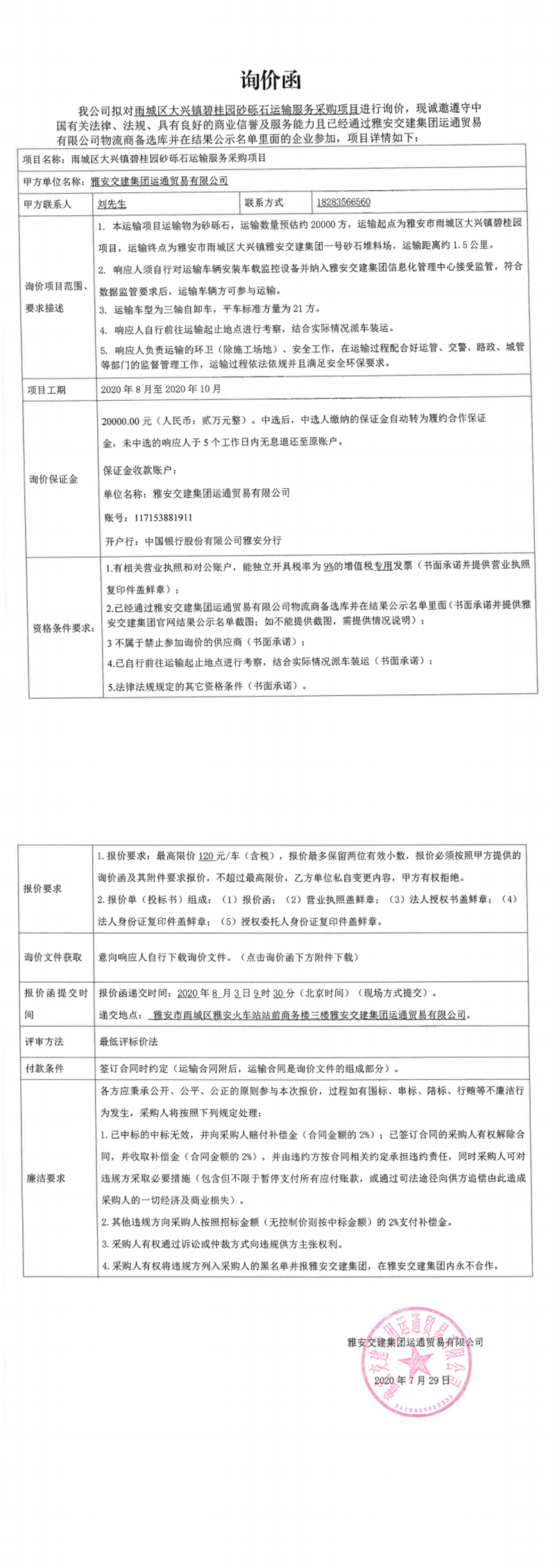 雅安交建集團(tuán)運通貿(mào)易有限公司雨城區(qū)大興鎮(zhèn)碧桂園砂礫石運輸服務(wù)采購項目(第二次)詢價函
