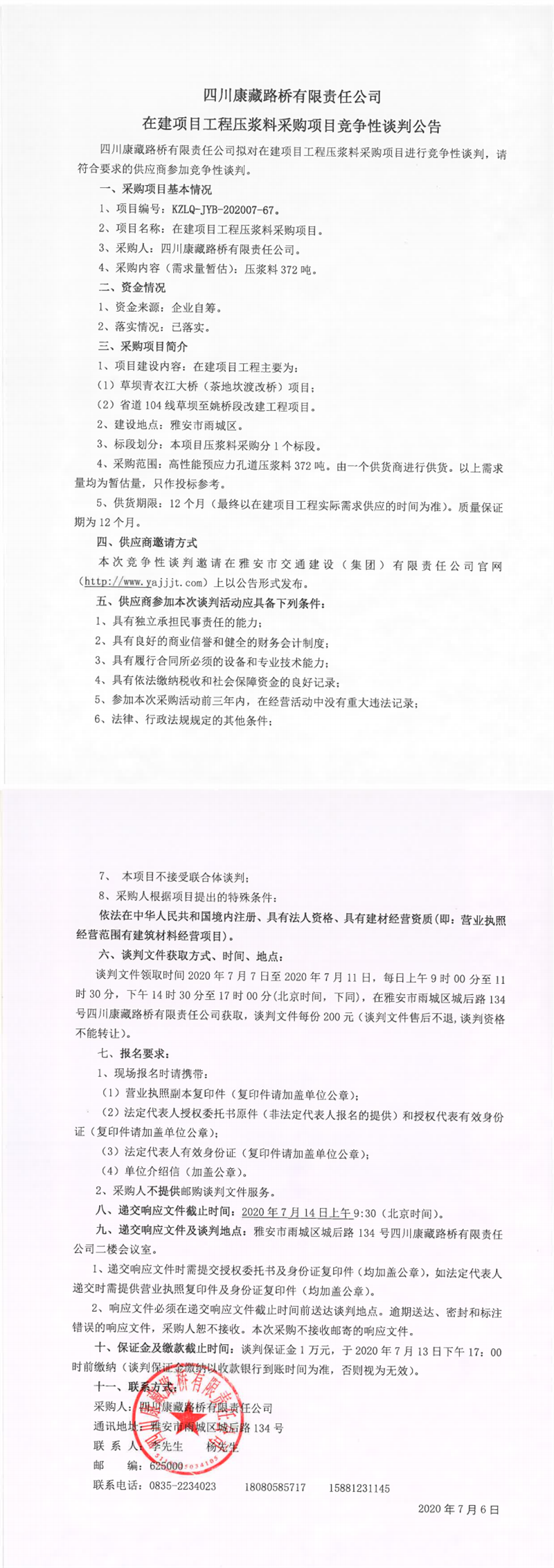 四川康藏路橋有限責(zé)任公司在建項(xiàng)目工程壓漿料采購項(xiàng)目競(jìng)爭(zhēng)性談判公告