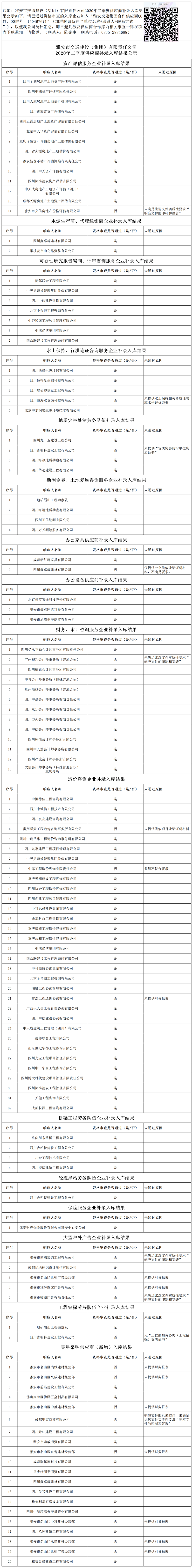 雅安市交通建設(shè)(集團(tuán))有限責(zé)任公司2020年二季度供應(yīng)商補(bǔ)錄入庫(kù)結(jié)果公示