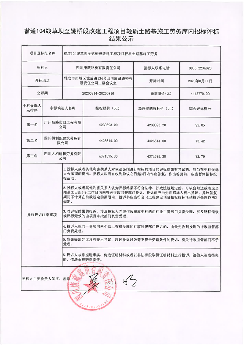 四川康藏路橋有限責(zé)任公司省道104線草壩至姚橋段改建工程項(xiàng)目輕質(zhì)土路基施工勞務(wù)庫內(nèi)招標(biāo)評(píng)標(biāo)結(jié)果公示