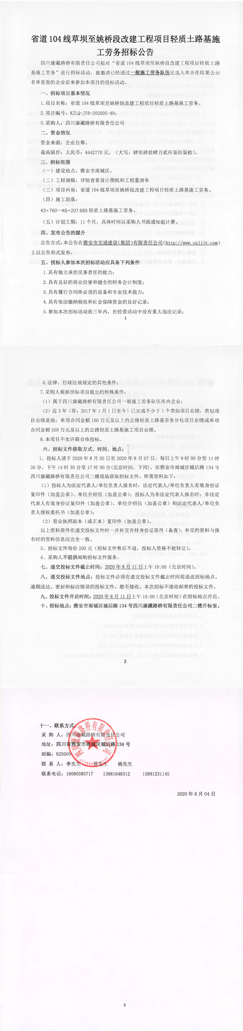 四川康藏路橋有限責任公司省道104線草壩至姚橋段改建工程項目輕質(zhì)土路基施工勞務招標公告