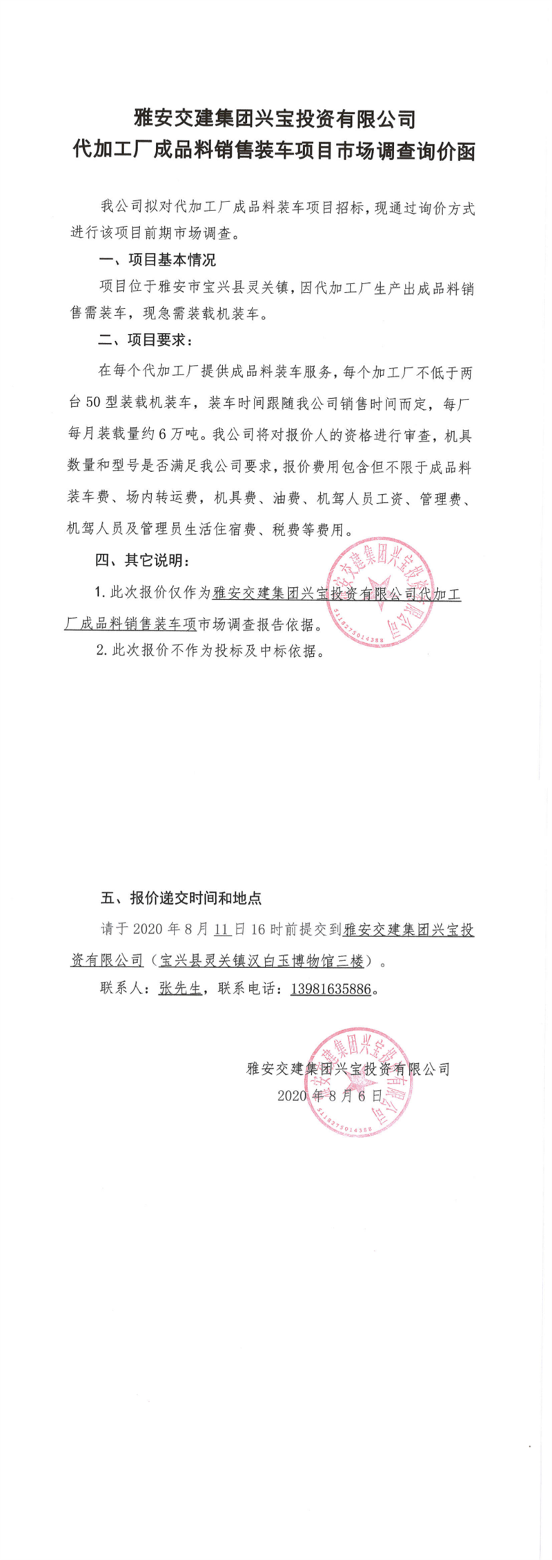 雅安交建集團(tuán)興寶投資有限公司代加工成品料銷售裝車項目市場調(diào)查詢價函