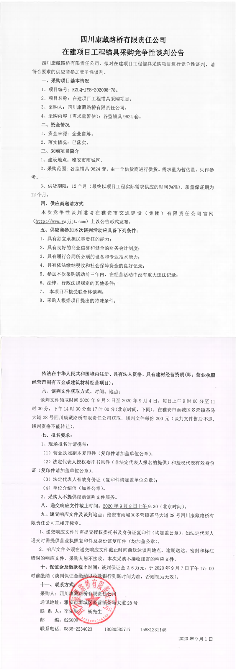 四川康藏路橋有限責(zé)任公司在建項目工程錨具采購競爭性談判公告