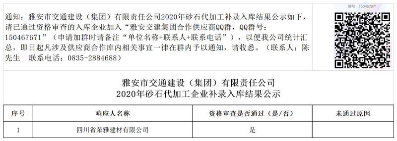 雅安市交通建設(shè)(集團)有限責任公司2020年砂石代加工企業(yè)補錄入庫結(jié)果公示