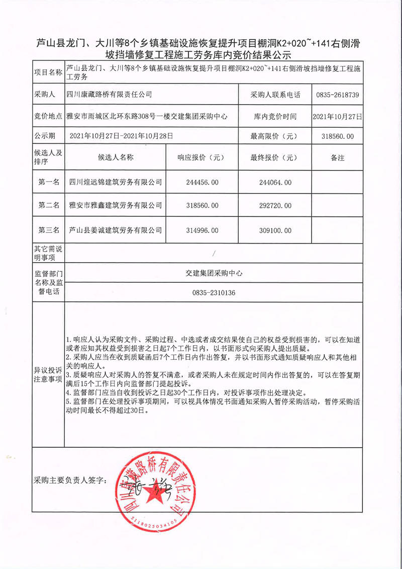 四川康藏路橋有限責任公司蘆山縣龍門、大川等8個鄉(xiāng)鎮(zhèn)基礎(chǔ)設(shè)施恢復(fù)提升項目棚洞K2+020~+141右側(cè)滑坡?lián)鯄π迯?fù)工程施工勞務(wù)庫內(nèi)競價結(jié)果公示
