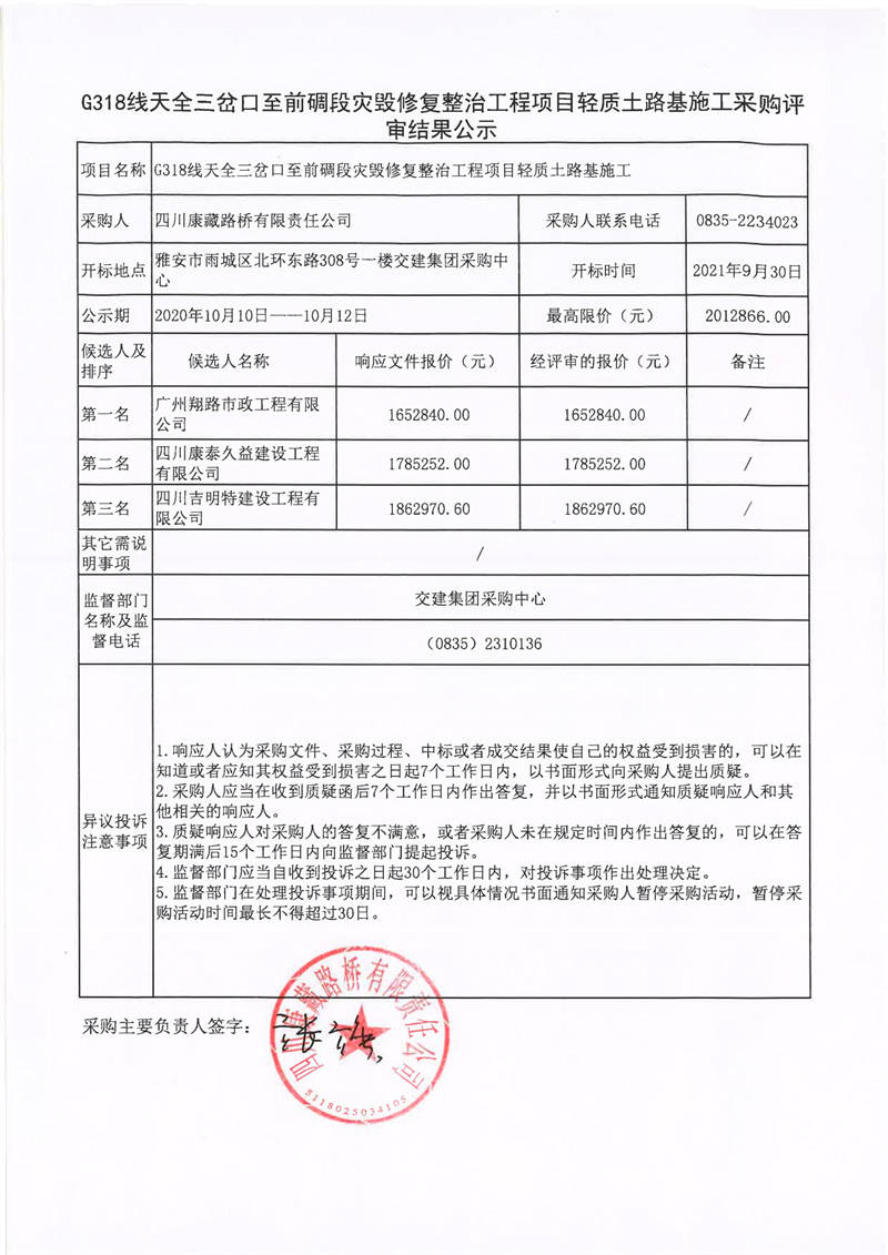 四川康藏路橋有限責(zé)任公司G318線天全三岔口至前碉段災(zāi)毀修復(fù)整治工程項(xiàng)目輕質(zhì)土路基施工采購(gòu)評(píng)審結(jié)果公示