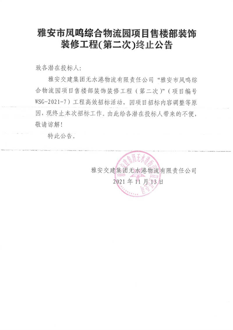 雅安交建集團(tuán)無水港物流有限責(zé)任公司雅安市鳳鳴綜合物流園項目售樓部裝飾裝修工程(第二次)終止公告