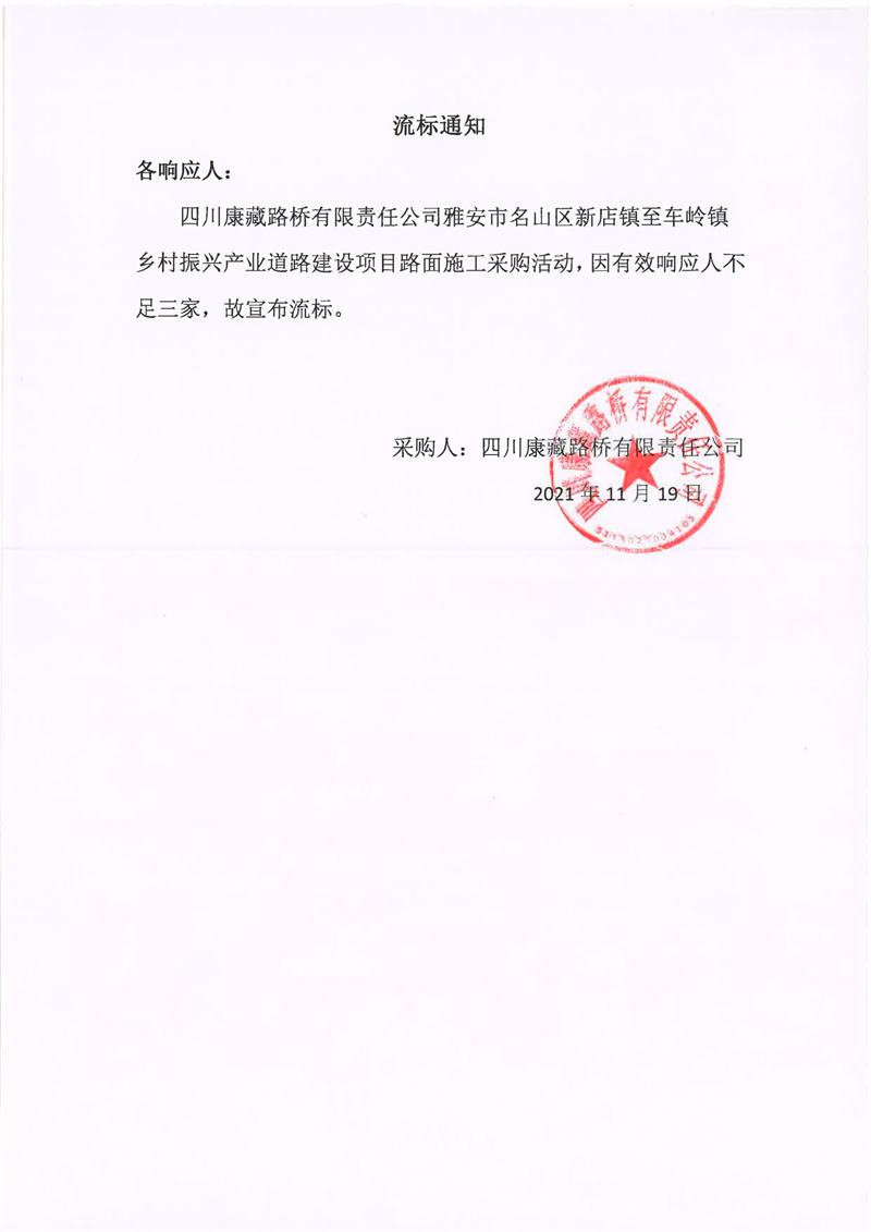 四川康藏路橋有限責(zé)任公司雅安市名山區(qū)新店鎮(zhèn)至車(chē)嶺鎮(zhèn)鄉(xiāng)村振興產(chǎn)業(yè)道路建設(shè)項(xiàng)目路面施工采購(gòu)流標(biāo)通知