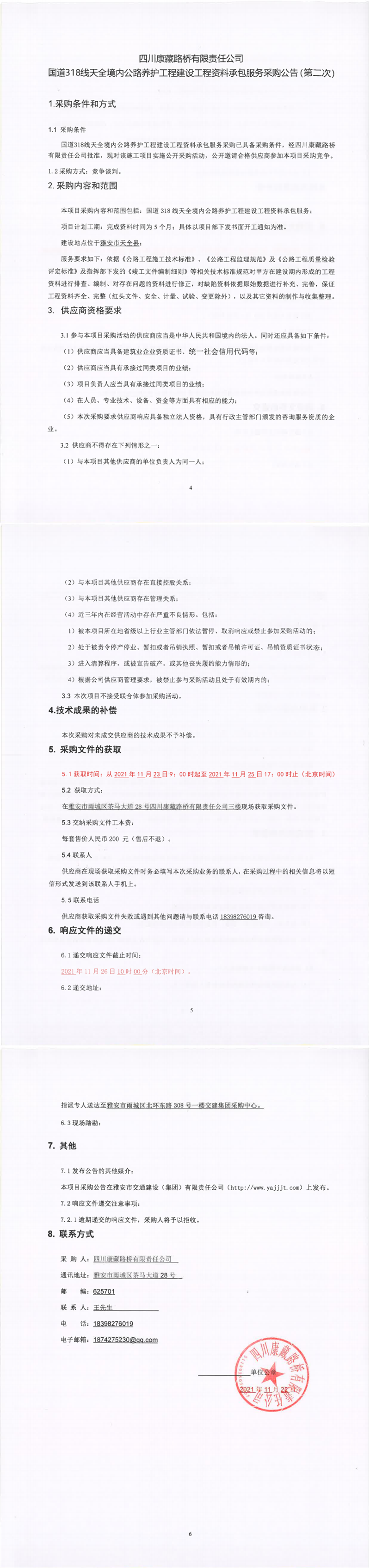 四川康藏路橋有限責(zé)任公司國道318線天全境內(nèi)公路養(yǎng)護工程建設(shè)工程資料承包服務(wù)采購公告(第二次)