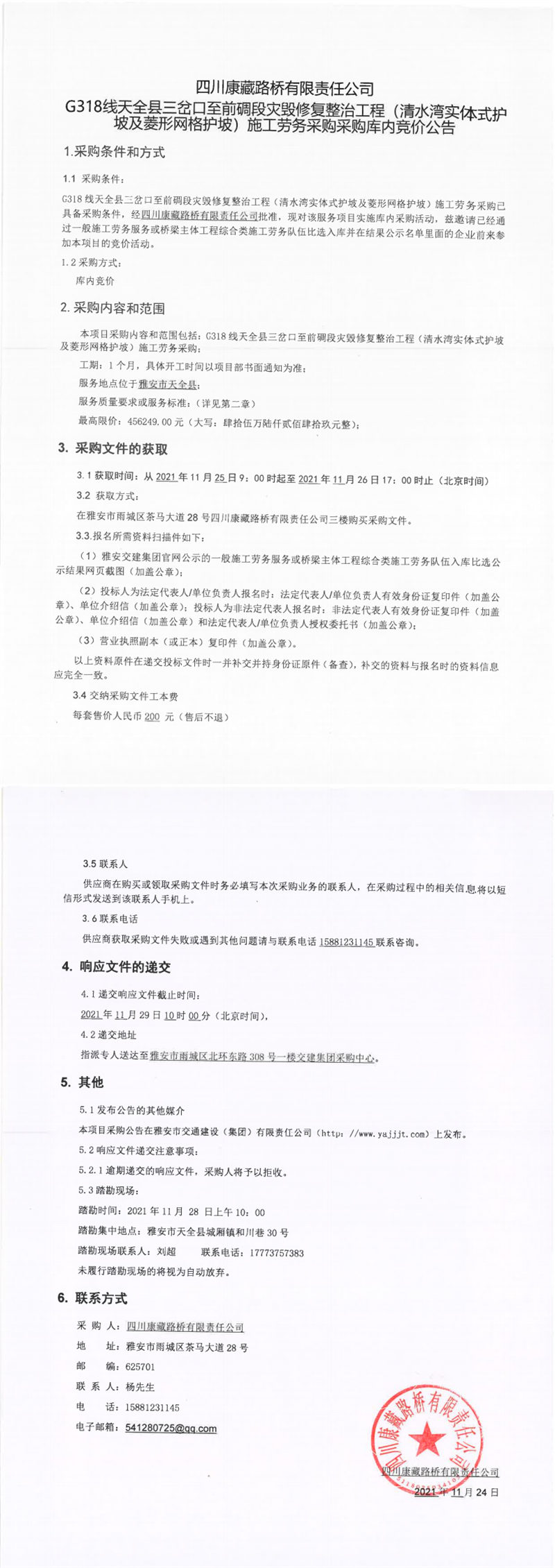 四川康藏路橋有限責(zé)任公司G318線天全縣三岔口至前碉段災(zāi)毀修復(fù)整治工程(清水灣實體式護坡及菱形網(wǎng)格護坡)施工勞務(wù)采購采購庫內(nèi)競價公告