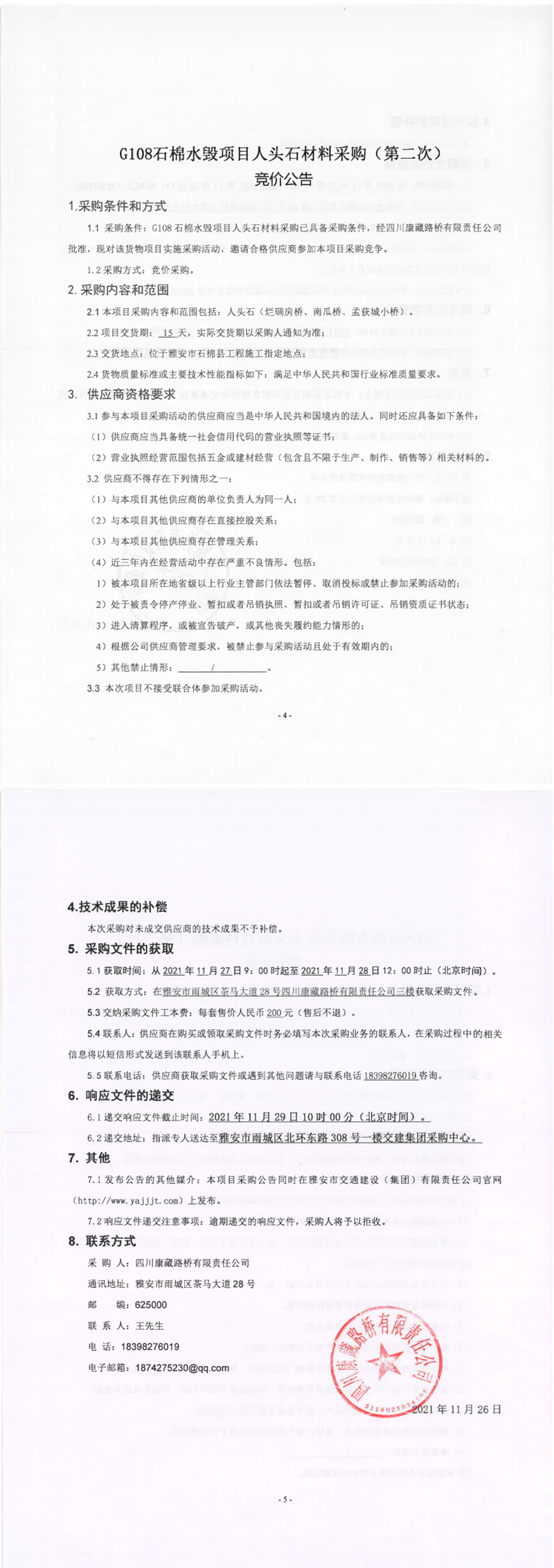 四川康藏路橋有限責任公司G108石棉水毀項目人頭石材料采購流標通知