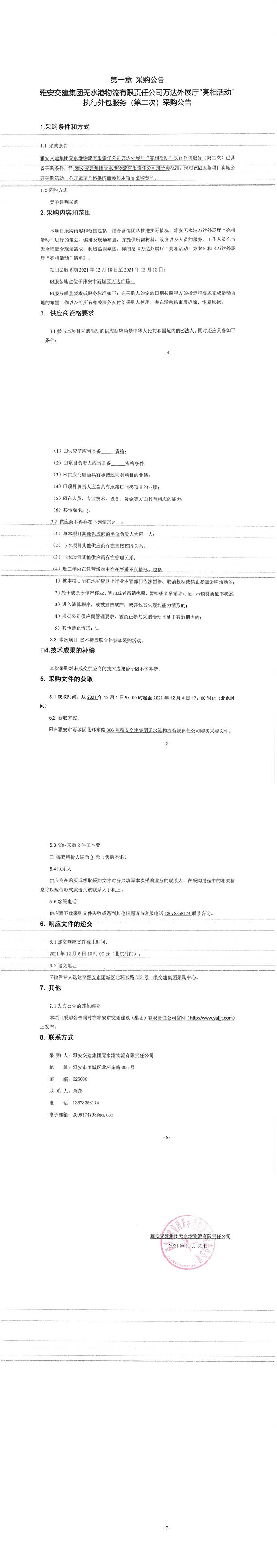 雅安交建集團無水港物流有限責(zé)任公司萬達外展廳“亮相活動”執(zhí)行外包服務(wù)(第二次)采購公告
