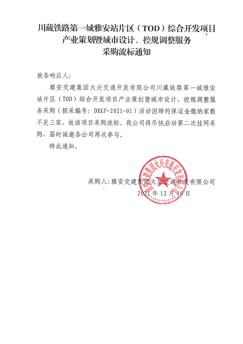 雅安交建集團(tuán)大興交通開發(fā)有限公司川藏鐵路第一城雅安站片區(qū)(TOD)綜合開發(fā)項目產(chǎn)業(yè)策劃暨城市設(shè)計、控規(guī)調(diào)整服務(wù)采購流標(biāo)通知