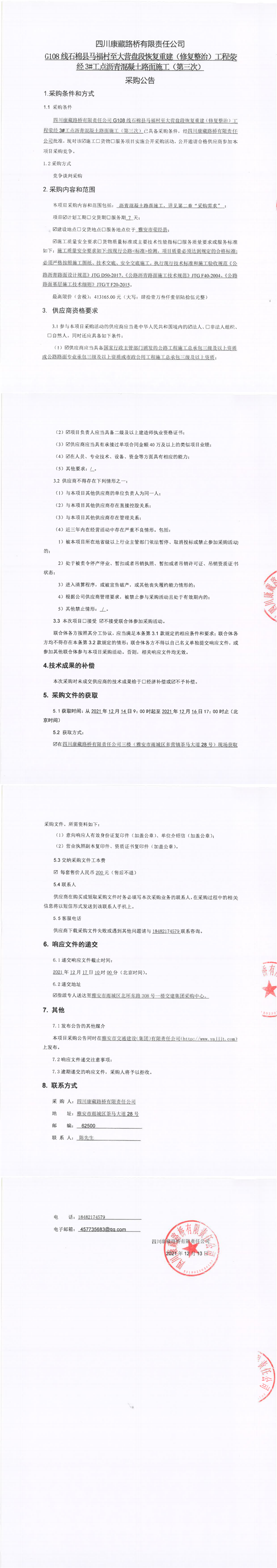 四川康藏路橋有限責任公司G108線石棉縣馬福村至大營盤段恢復重建(修復整治)工程滎經3#工點瀝青混凝土路面施工(第三次)采購公告