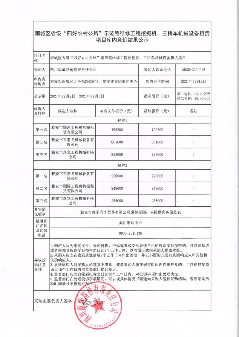 四川康藏路橋有限責(zé)任公司雨城區(qū)省級“四好農(nóng)村路”示范路維修工程挖掘機、三橋車機械設(shè)備租賃項目庫內(nèi)競價結(jié)果公示