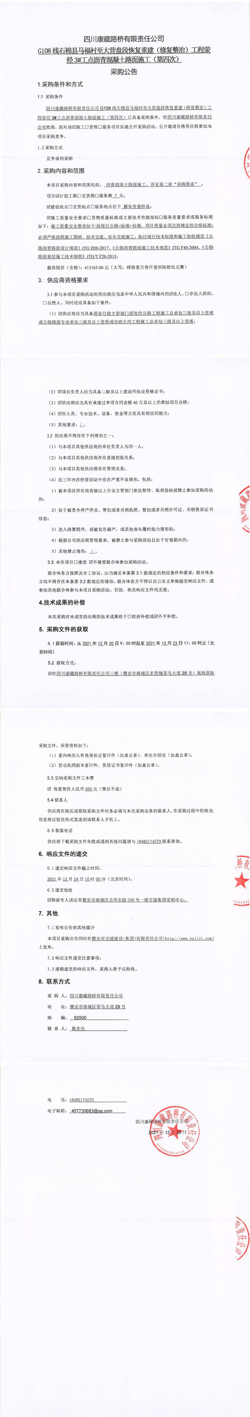 四川康藏路橋有限責(zé)任公司G108線(xiàn)石棉縣馬福村至大營(yíng)盤(pán)段恢復(fù)重建(修復(fù)整治)工程滎經(jīng)3#工點(diǎn)瀝青混凝土路面施工(第四次)采購(gòu)公告