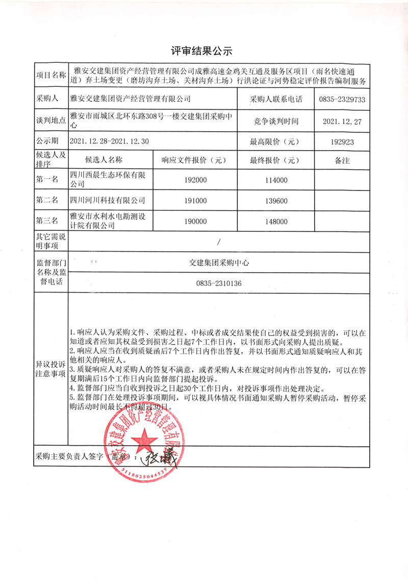 雅安交建集團資產(chǎn)經(jīng)營管理有限公司成雅高速金雞關互通及服務區(qū)項目(雨名快速通道)棄土場變更(磨坊溝棄土場、關材溝棄土場)行洪論證與河勢穩(wěn)定評價報告編制服務評審結(jié)果公示