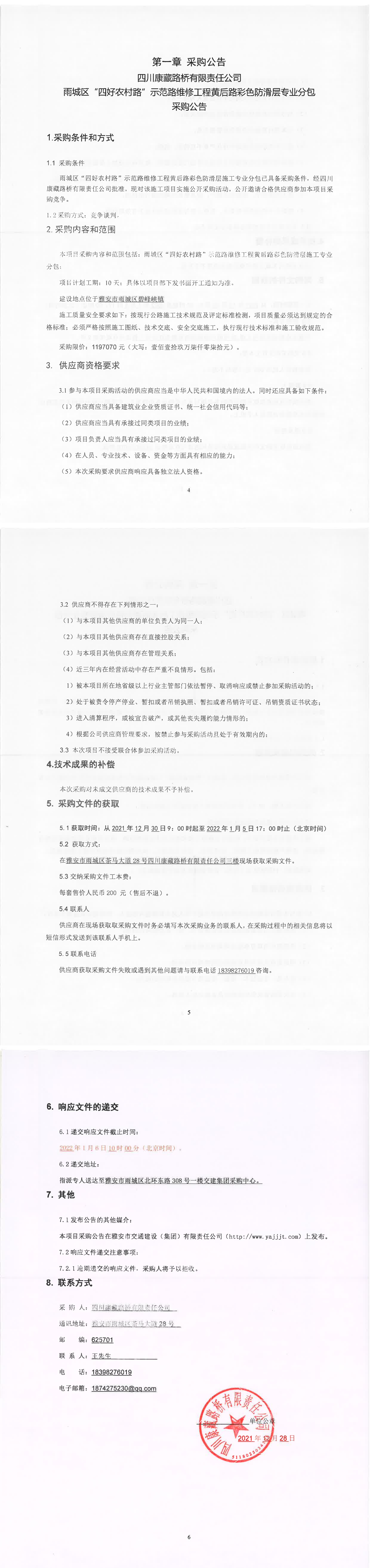 四川康藏路橋有限責(zé)任公司雨城區(qū)“四好農(nóng)村路”示范路維修工程黃后路彩色防滑層專業(yè)分包采購公告