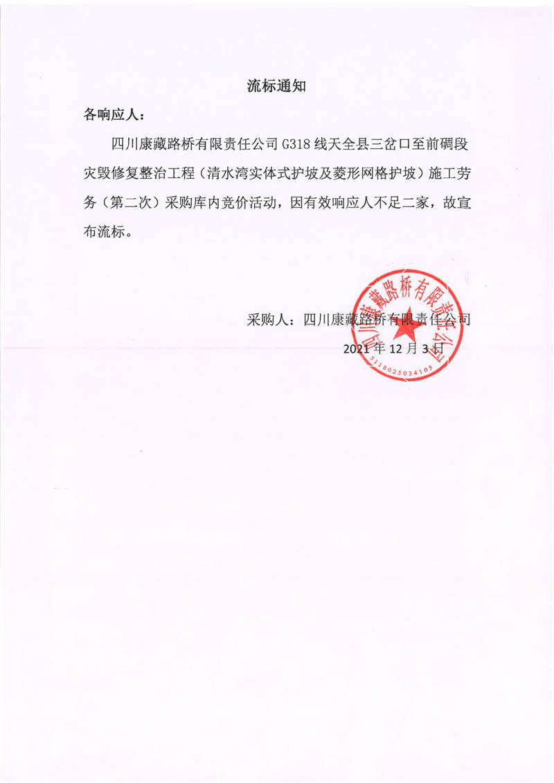 四川康藏路橋有限責(zé)任公司G318線天全縣三岔口至前碉段災(zāi)毀修復(fù)整治工程(清水灣實體式護坡及菱形網(wǎng)格護坡)施工勞務(wù)(第二次)采購流標通知