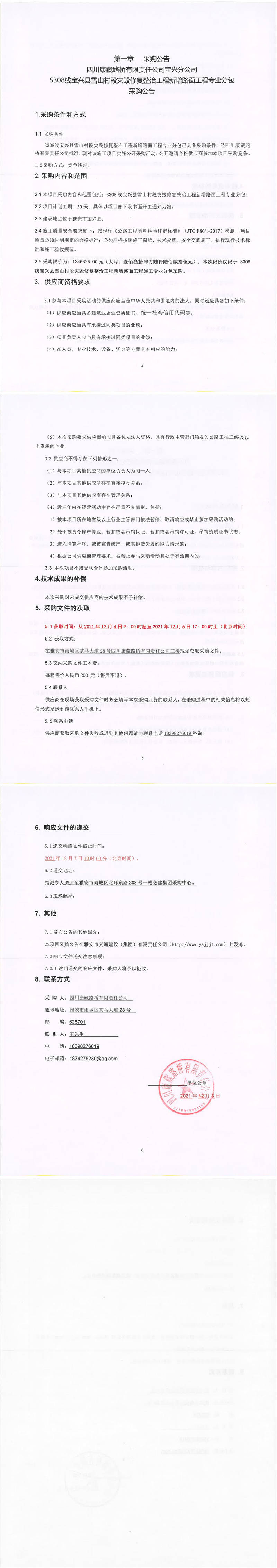 四川康藏路橋有限責任公司S308線寶興縣雪山村段災毀修復整治工程新增路面工程施工專業(yè)分包采購公告
