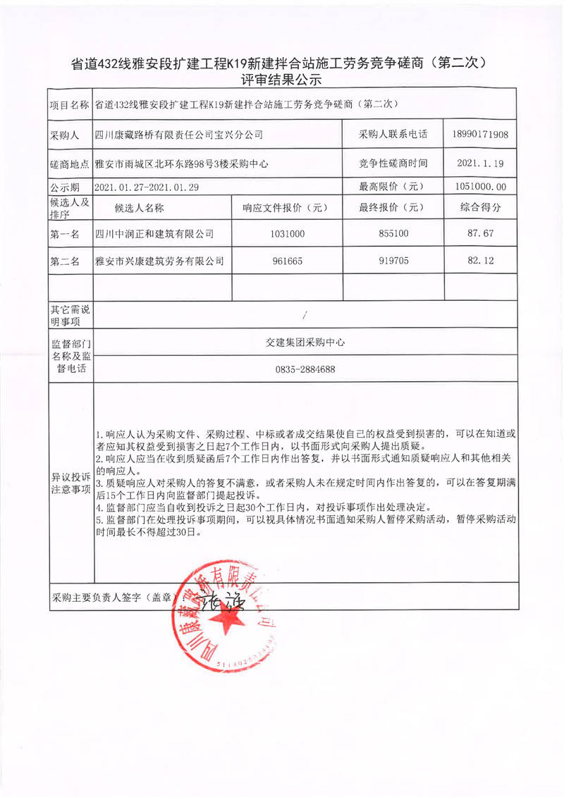 四川康藏路橋有限責(zé)任公司寶興分公司省道432線雅安段擴(kuò)建工程K19新建拌合站施工勞務(wù)競爭磋商(第二次)評審結(jié)果公示