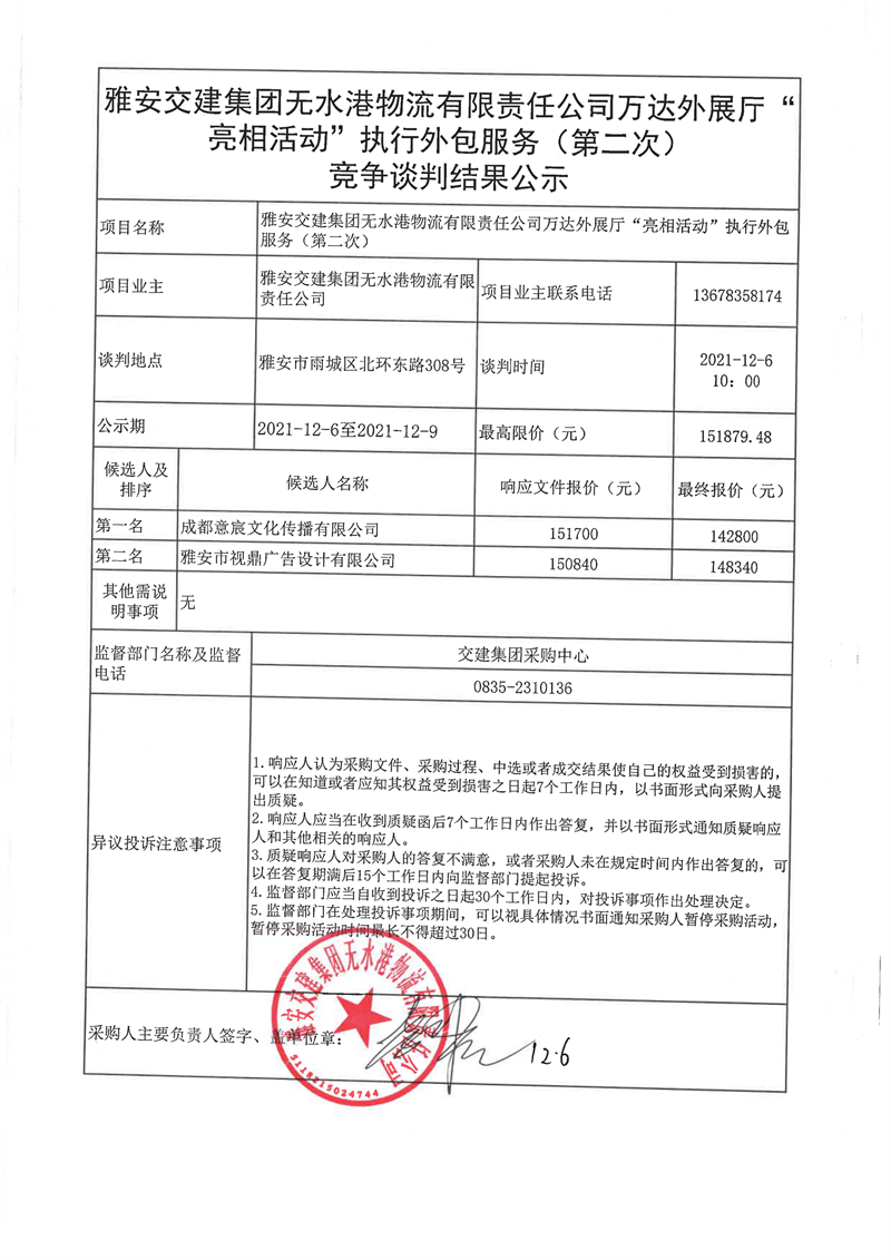雅安交建集團無水港物流有限責任公司萬達外展廳“亮相活動”執(zhí)行外包服務(wù)(第二次)競爭談判結(jié)果公示