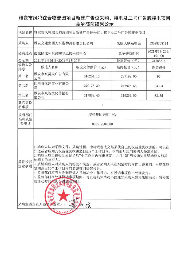 雅安交建集團(tuán)無水港物流有限責(zé)任公司雅安市鳳鳴綜合物流園項(xiàng)目新建廣告位采購、接電及二號(hào)廣告牌接電項(xiàng)目競(jìng)爭(zhēng)磋商結(jié)果公示