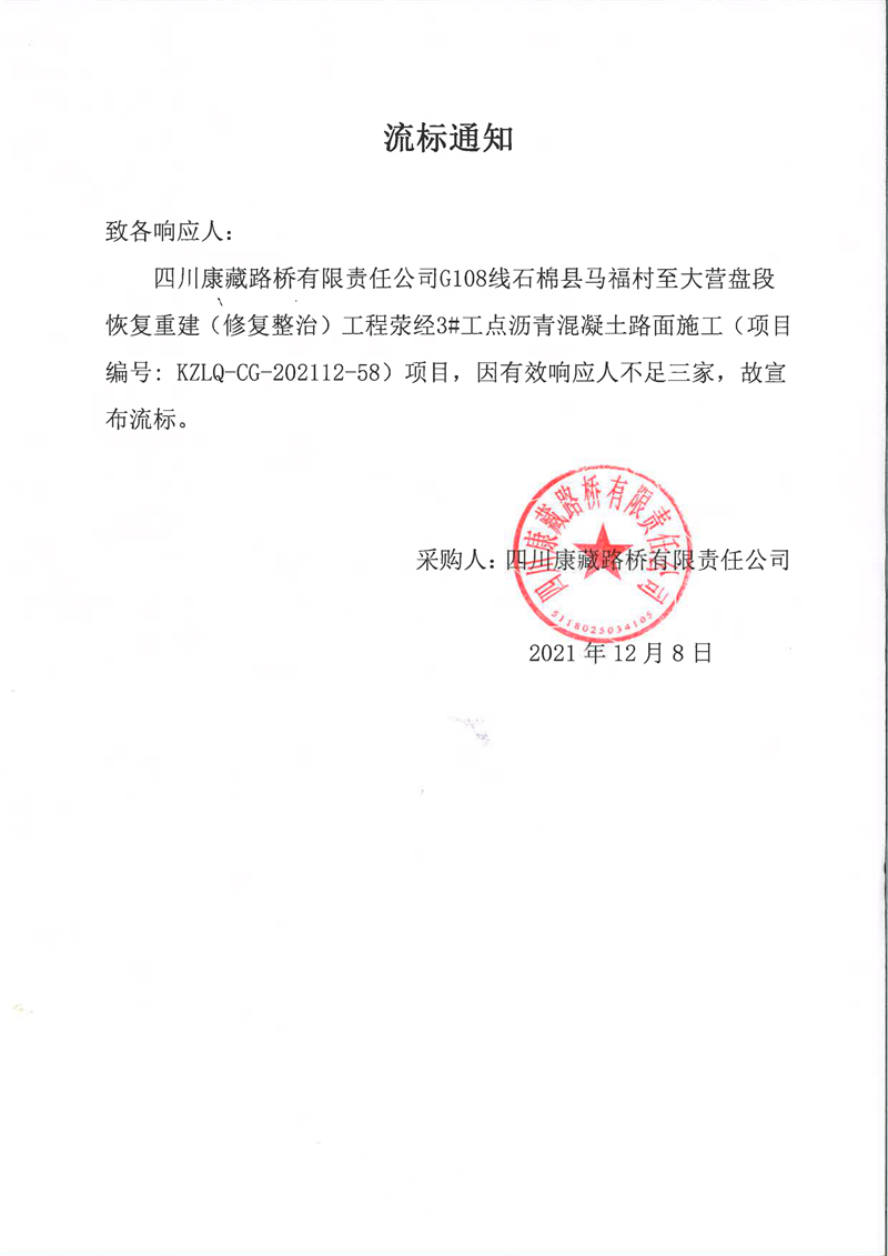 四川康藏路橋有限責任公司G108線石棉縣馬福村至大營盤段恢復(fù)重建(修復(fù)整治)工程滎經(jīng)3#工點瀝青混凝土路面施工流標通知