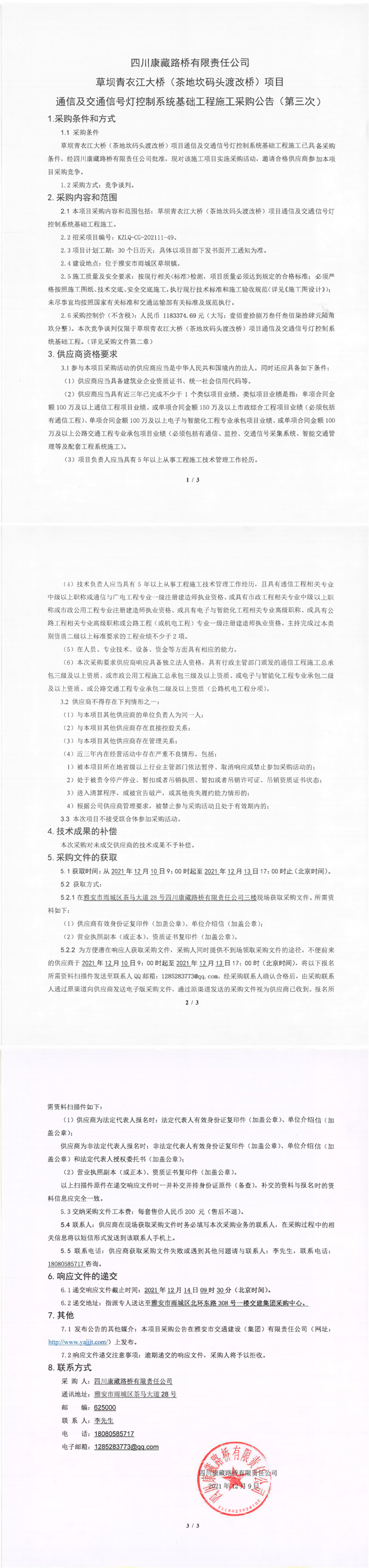四川康藏路橋有限責(zé)任公司草壩青衣江大橋(茶地坎碼頭渡改橋)項(xiàng)目通信及交通信號(hào)燈控制系統(tǒng)基礎(chǔ)工程施工采購(gòu)公告(第三次)