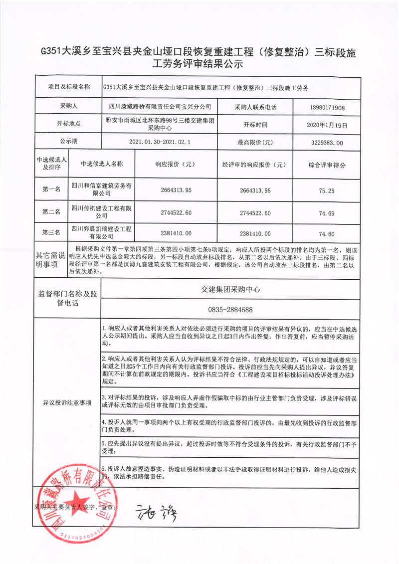 四川康藏路橋有限責(zé)任公司G351大溪鄉(xiāng)至寶興縣夾金山埡口段恢復(fù)重建工程(修復(fù)整治)四標(biāo)段施工勞務(wù)評(píng)審結(jié)果公示