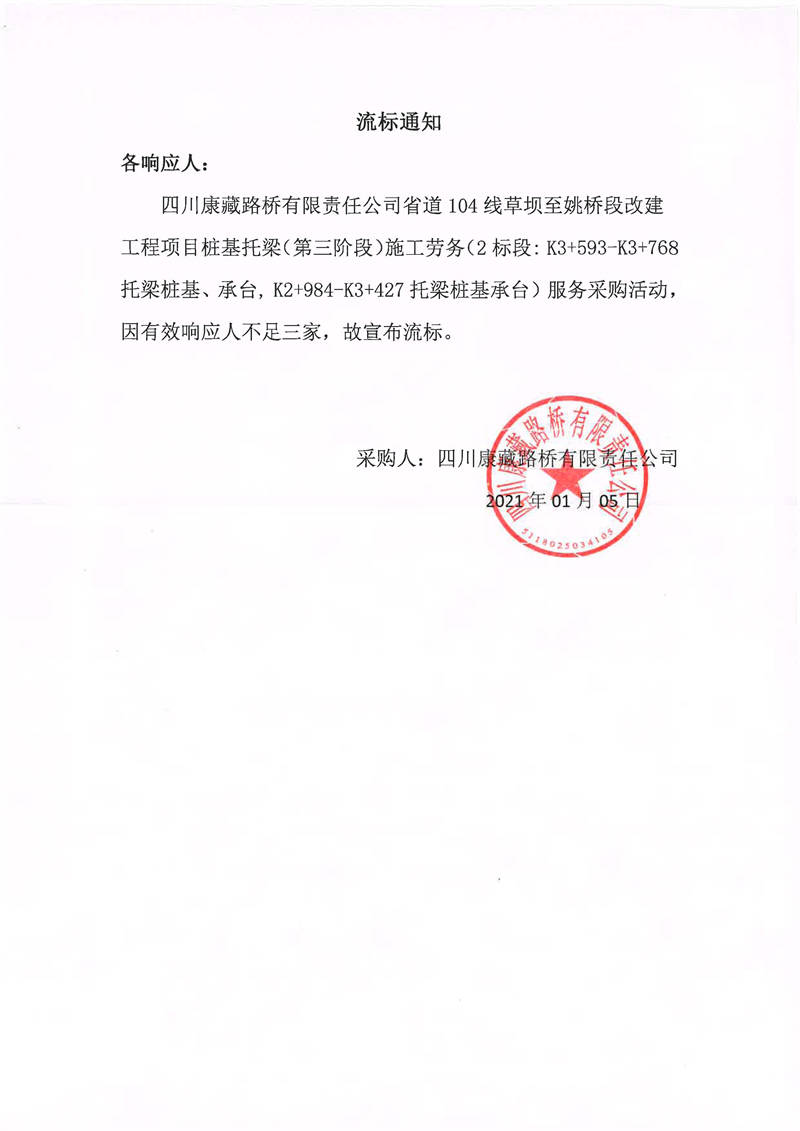 四川康藏路橋有限責任公司省道104線草壩至姚橋段改建工程項目樁基托梁(第三階段)施工勞務服務2標段流標通知