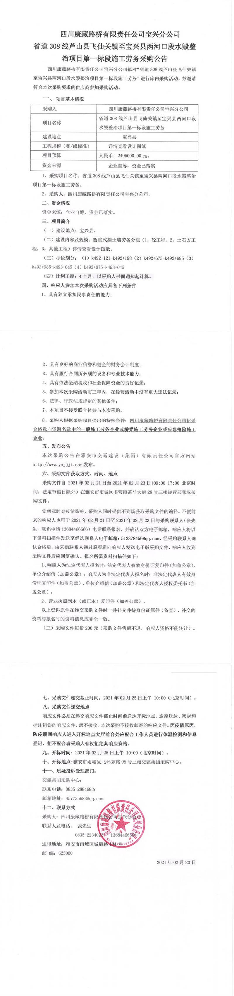 四川康藏路橋有限責任公司寶興分公司省道308線蘆山縣飛仙關(guān)鎮(zhèn)至寶興縣兩河口段水毀整治項目第一標段施工勞務(wù)采購公告